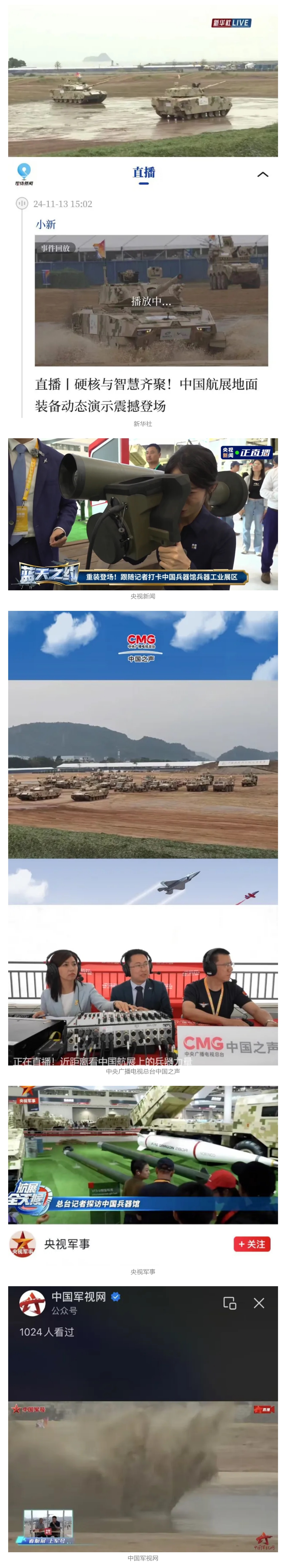 新華社、央視新聞、中央廣播電視總臺中國之聲、央視軍事、中國軍視網、廣東廣播電視臺等媒體以及國家國防科工局、國資小新等到兵器工業集團地面動態演示區、中國兵器館進行了直播。