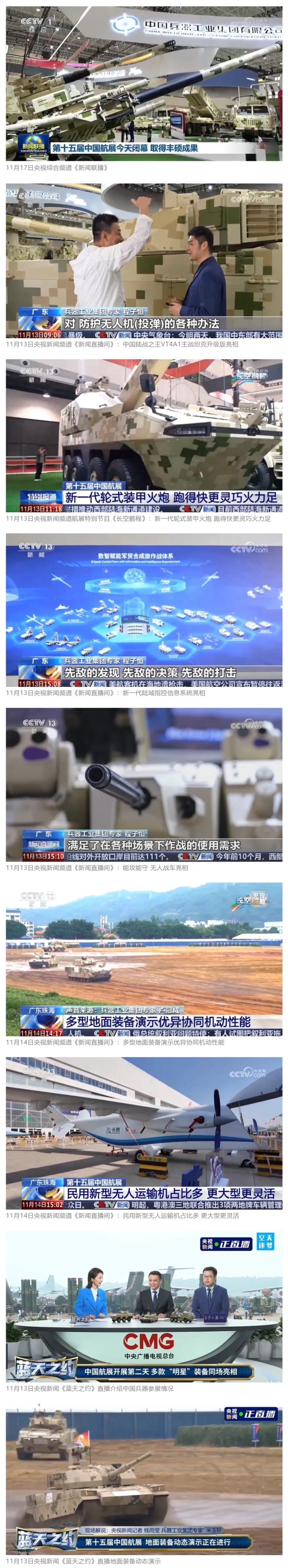 11月13日央視新聞《藍天之約》直播地面裝備動態演示此次航展,央視綜合頻道《新聞聯播》《晚間新聞》、新聞頻道《新聞直播間》《新聞30分》《朝聞天下》《共同關注》《東方時空》《午夜新聞》、財經頻道《天下財經》《經濟信息聯播》《正點財經》《第一時間》、中文國際頻道《今日環球》《中國新聞》、國防軍事頻道《軍事報道》《正午國防軍事》《國防軍事早報》《軍迷行天下》等欄目共播出兵器工業集團參展相關新聞報道40余條。11月10日央視新聞頻道《新聞30分》11月10日央視中文國際頻道《中國新聞》11月10日央視國防軍事頻道《軍事報道》11月11日央視國防軍事頻道《正午國防軍事》