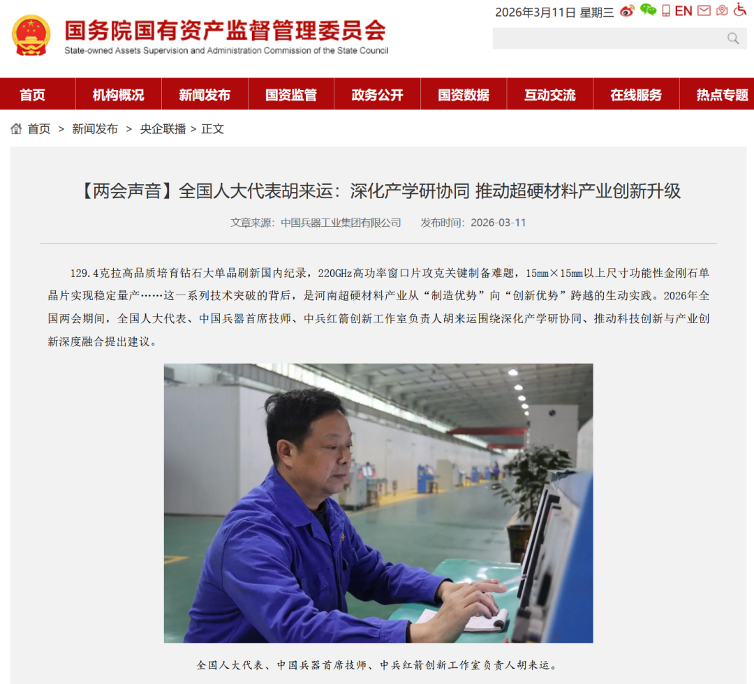 國務院國資委網站-【兩會聲音】全國人大代表胡來運:深化產學研協同 推動超硬材料產業創新升級