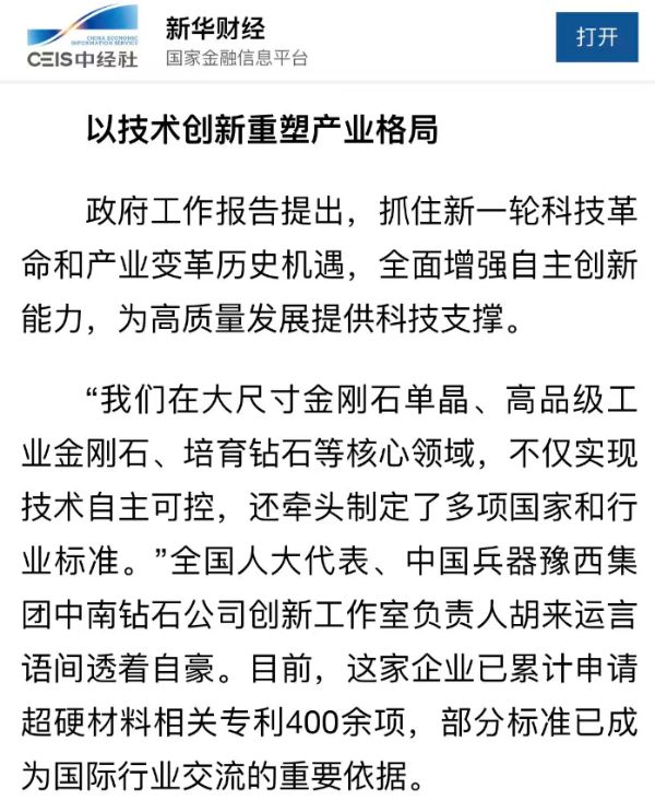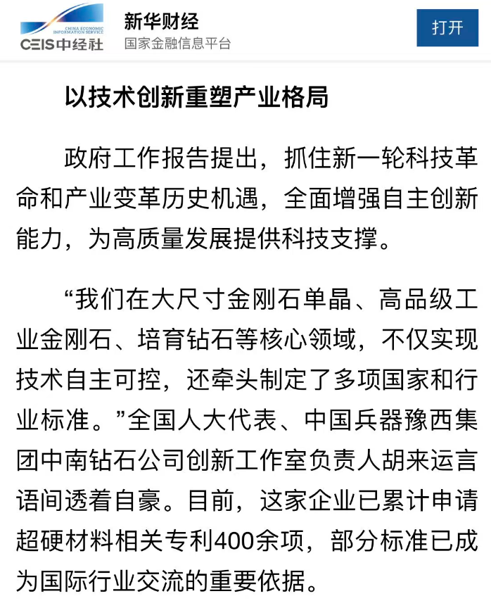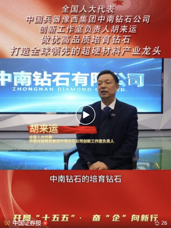中國證券報-全國人大代表、中國兵器豫西集團中南鉆石公司創新工作室負責人胡來運:做優高品質培育鉆石 打造全球領先的超硬材料產業龍頭