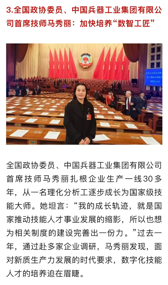 中國兵器工業集團首席技師馬秀麗委員結合自身成長經歷建言。她表示,技能人才成長離不開平臺和社會重視,要深化產教融合,讓企業成為培養主體,共建數字化實訓基地,培育適配新質生產力的數字化技能人才;設立“工匠日”,厚植工匠精神,引導青年走技能報國之路,讓技能職工實現自我價值。