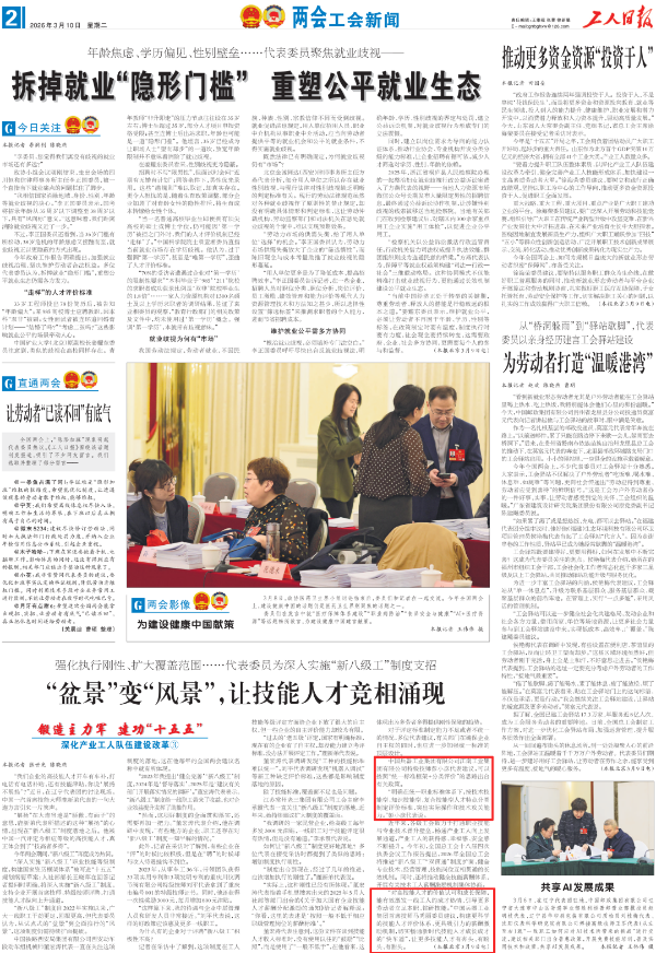 “對高技能人才的價值認可和成長保障,能有效激發一線工人的成才熱情,引導更多勞動者立足本職、鉆研技能。”中國兵器工業集團首席技師馬秀麗委員建議,構建更科學的技能人才評價體系、更具吸引力的薪酬激勵機制,切實暢通新時代技能人才成長成才的“快車道”,讓更多技能人才有奔頭、有盼頭、有甜頭。